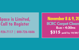 IICRC Carpet Cleaning November 8 & 9, 2016 Instructor: Doug Heiferman 8:00 AM – 4:30 PM IICRC Carpet Cleaning Class, November 2016, details Pre-Registration - $315 (If paid by 10/20/16) Registration - $365 Receive 2 IICRC Continuing Education Credits
