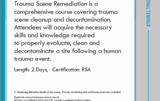 Trauma Scene Clean Up December 8 & 9, 2016 Instructor: Gary Loiben 8:00 AM – 4:30 PM Pre-Registration - $315 If paid by 11/17/16 Registration - $365 Receive 2 IICRC Continuing Education Credit & an RSA certification Seminar Schedule